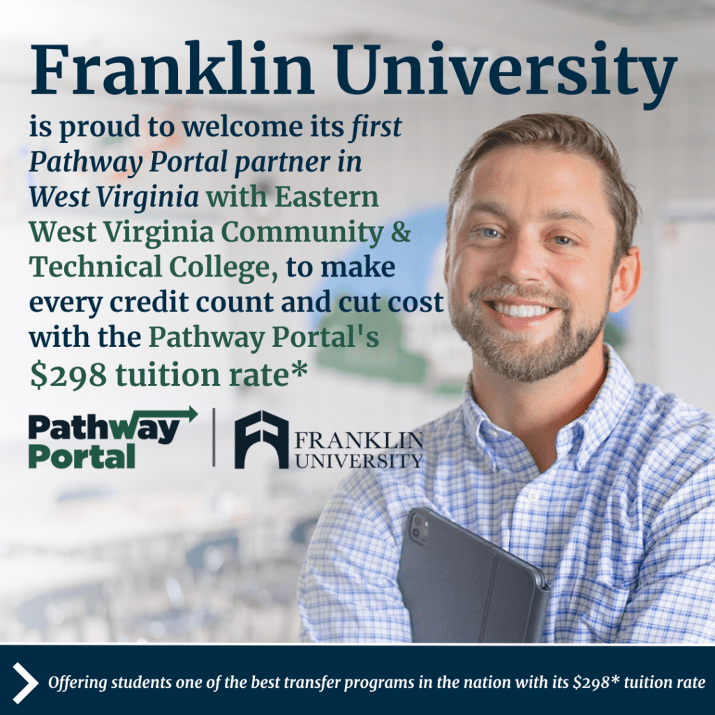 Columbus, OH (July 11, 2024) – Franklin University announces that it has expanded its articulation partnership with Eastern West Virginia Community & Technical College (EWVCTC). This collaboration marks the fifth institution outside Ohio to join the Pathway Portal, granting eligible EWVCTC students and alumni access to Franklin’s cutting-edge Pathway Portal and a special tuition rate of $298 per credit hour.