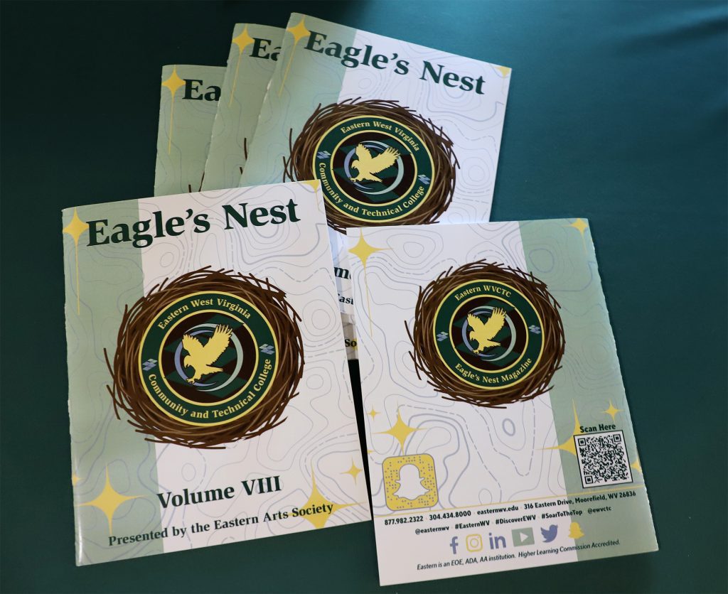 MOOREFIELD, W.Va. – The Eastern Arts Society at Eastern West Virginia Community and Technical College published the eighth volume of Eagle’s Nest magazine digitally on May 16, 2023, and then released it physically on June 13, 2023. Eagle’s Nest is an art and literary magazine that spotlights the talent of the Potomac Highlands and the surrounding regions. This magazine is funded through the Eastern Foundation, where the generous support of donors makes it possible to print physical versions of the magazine at the Grant County Press in Petersburg, WV.